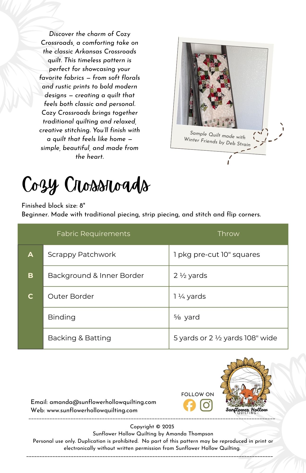 Discover the charm of Cozy Crossroads, a comforting take on the classic Arkansas Crossroads quilt. This timeless pattern is perfect for showcasing your favorite fabrics — from soft florals and rustic prints to bold modern designs — creating a quilt that feels both classic and personal.