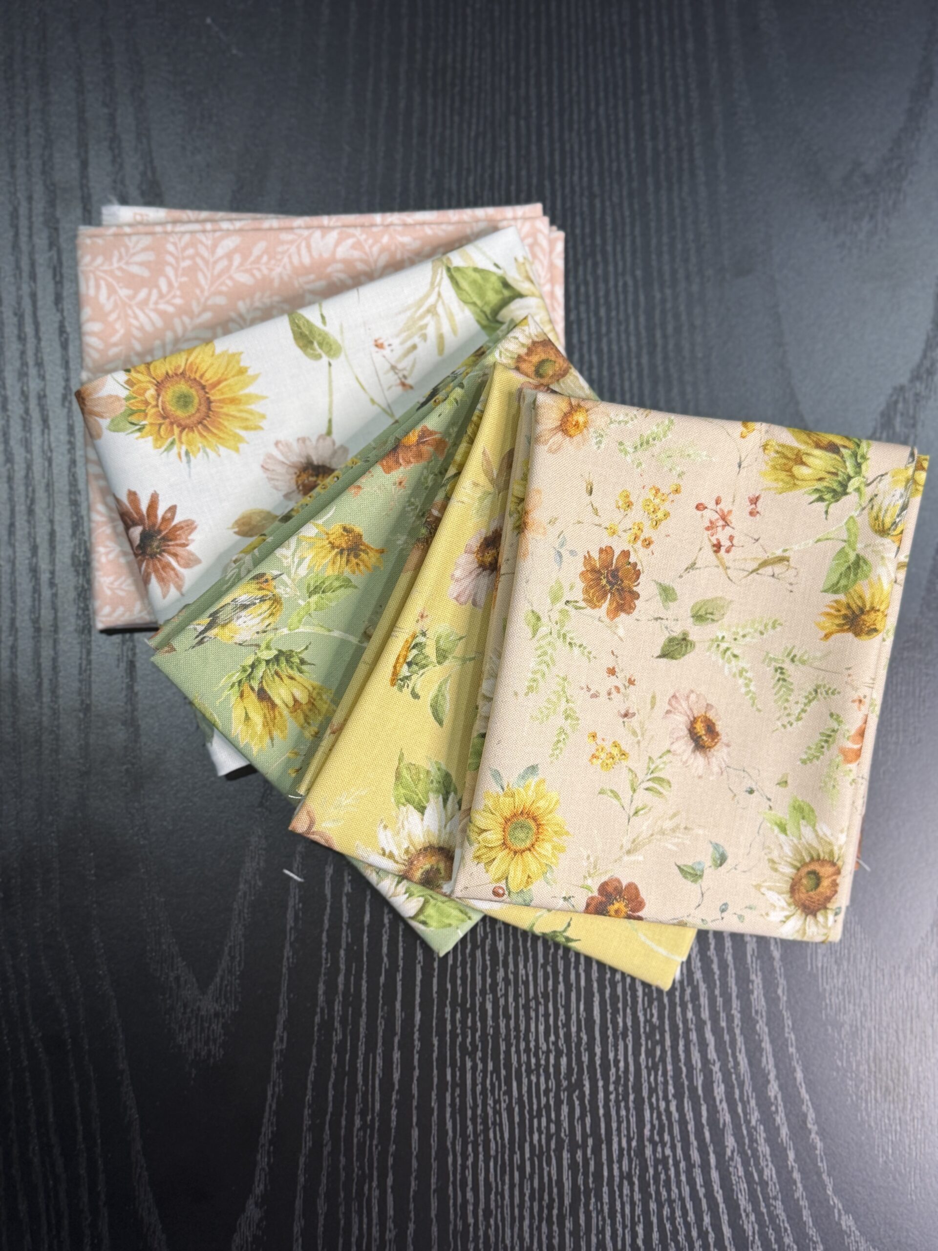 Sunflower Whispers Curated Fat Quarter Stack includes 5 fat quarters.